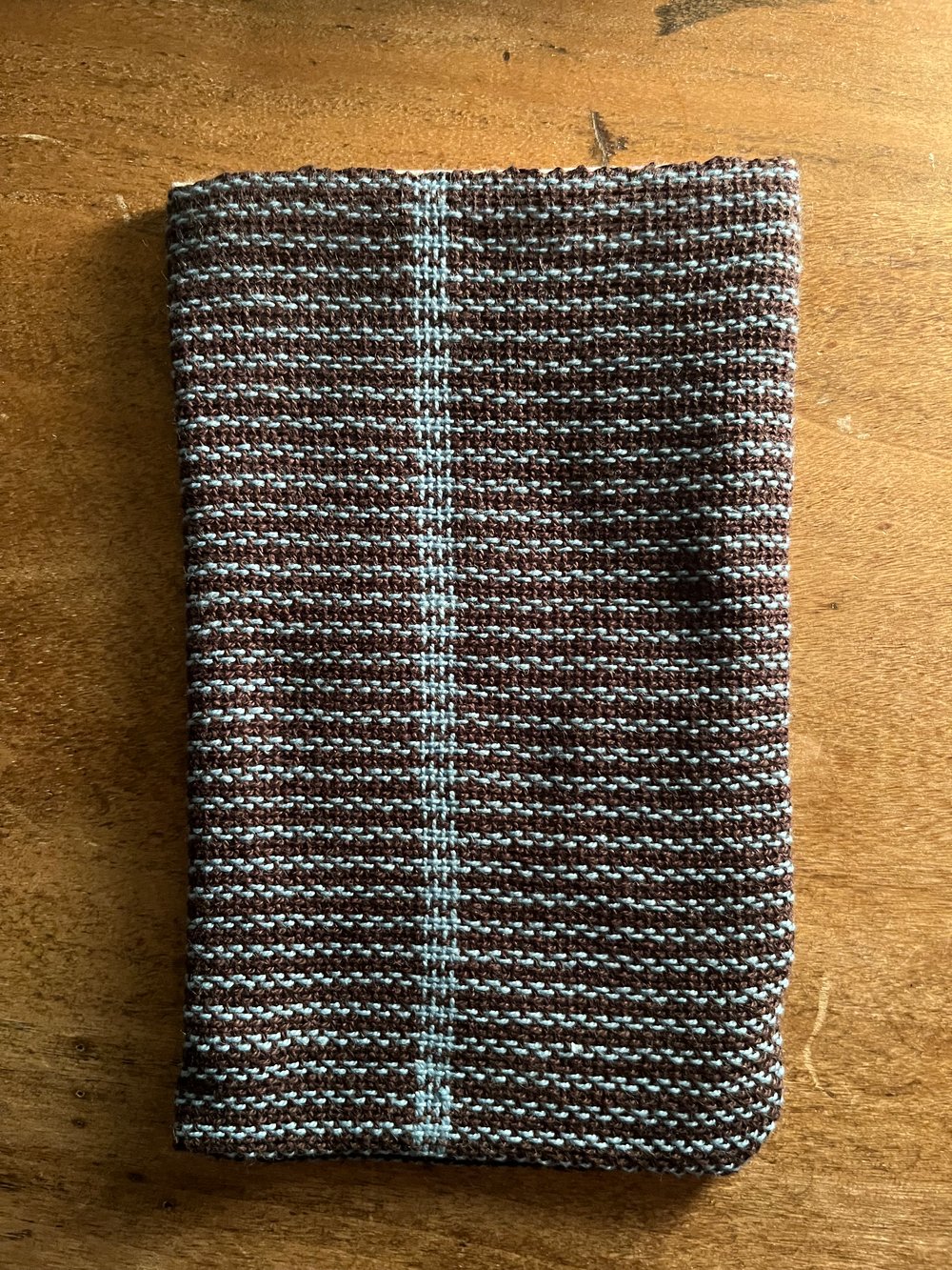 I (J) made this 5 x 7.5 inch vegan Phone Sleeper by weaving Brossard 2/8 cottons on an Ashford rigid heddle loom and sewed them together on our sewing machine (a Pfaff Smarter 160s), where I also made the soft cotton linings, and then hand-sewed them in with a needle and thread using a ladder stitch. Then I took their pictures, weighed and measured them to estimate shipping, and posted them here.