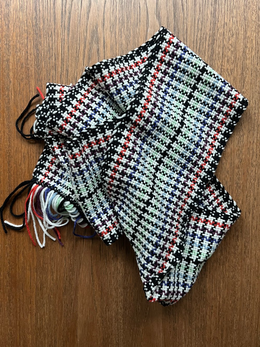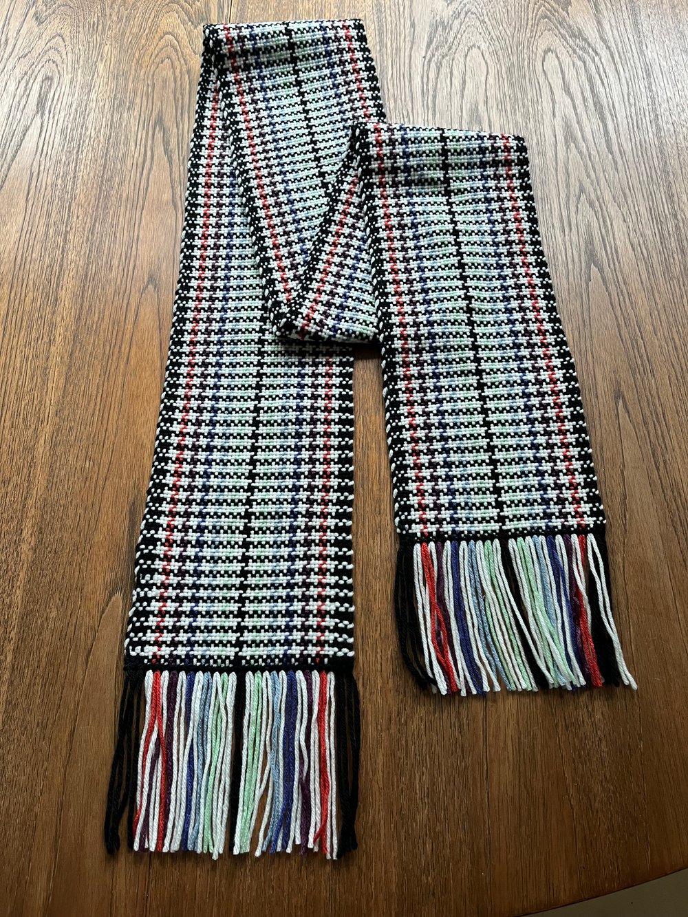A vegan 66 x 6 inch scarf made with acrylics by me (J) on a rigid heddle loom in September, 2023.