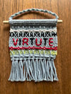 A 6 by 5-inch hand woven, embroidered, sewn and braided cotton wall-hanging made by J in April 2025, initialed and numbered.