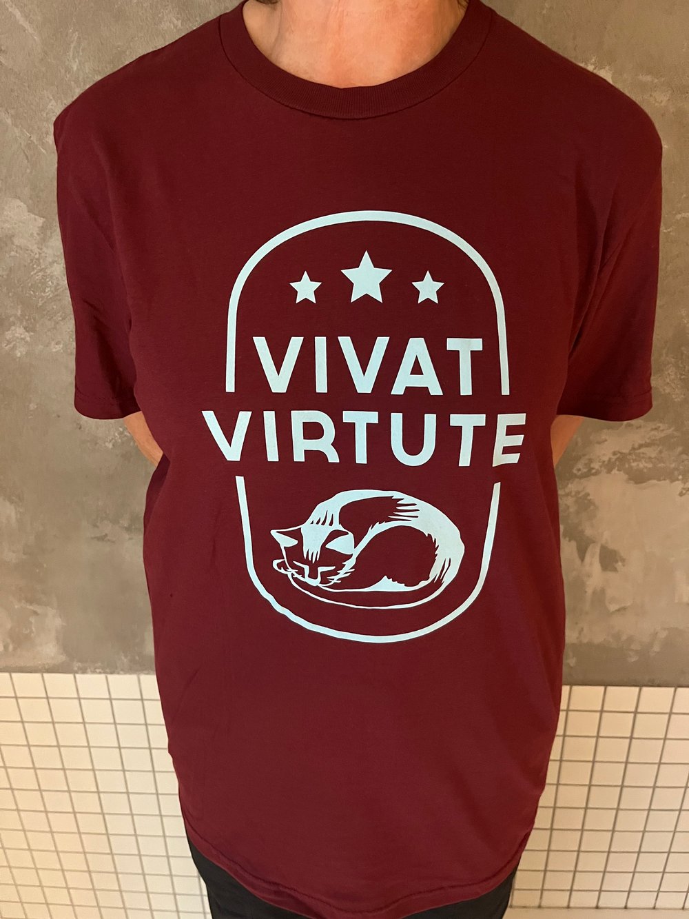 A cotton maroon VIVAT VIRTUTE t-shirt with a bluish logo printed at Floodway Printing Co. in Winnipeg! Click on "select option" for sizes. While supplies last.