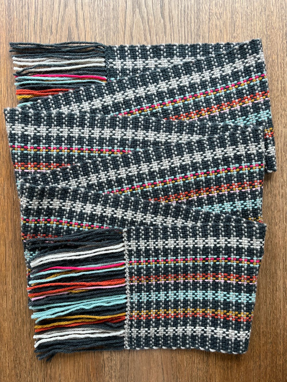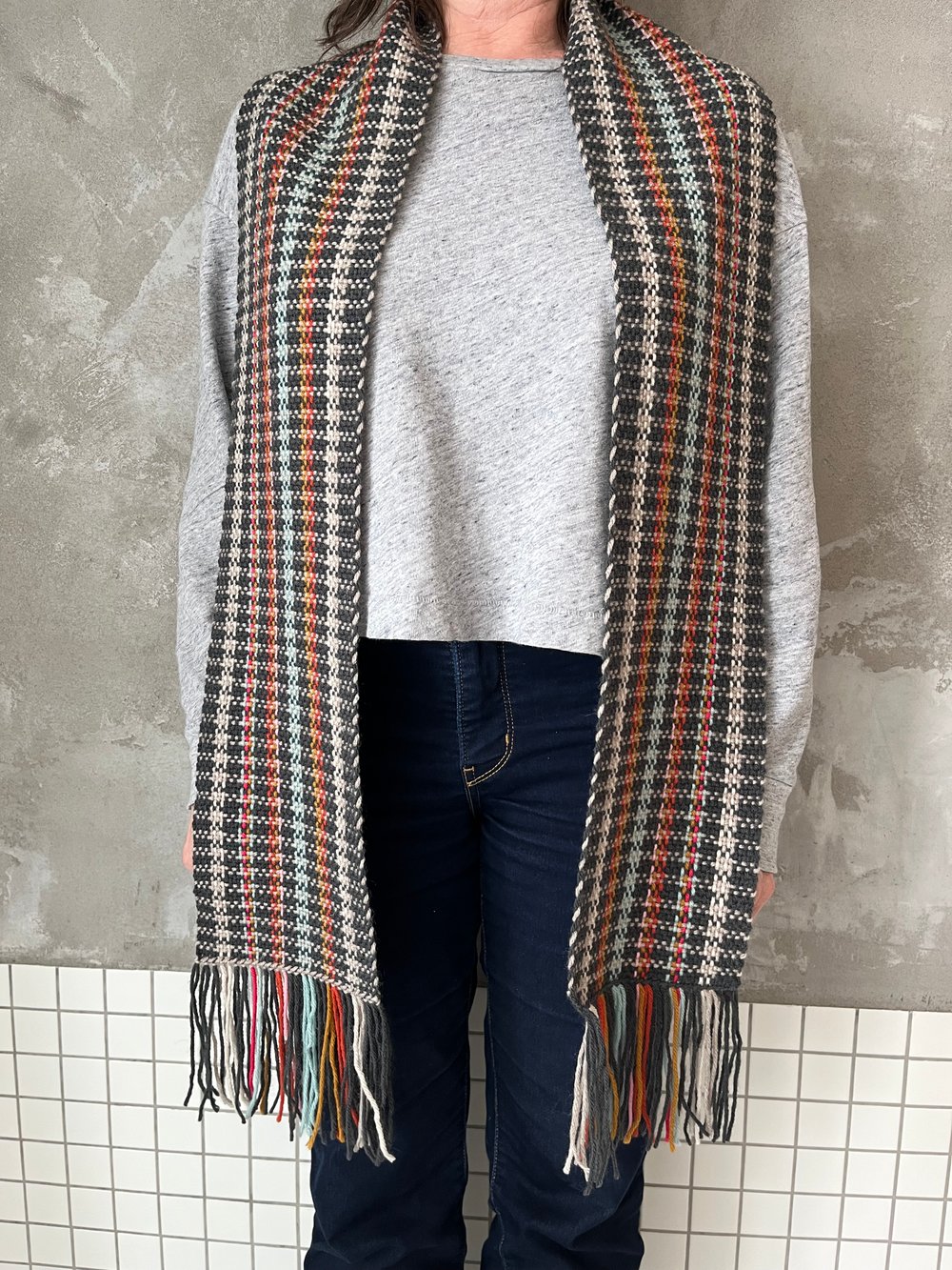 A 68 x 7 inch scarf made by J on a rigid heddle loom with wool and acrylic blends in April, 2023.